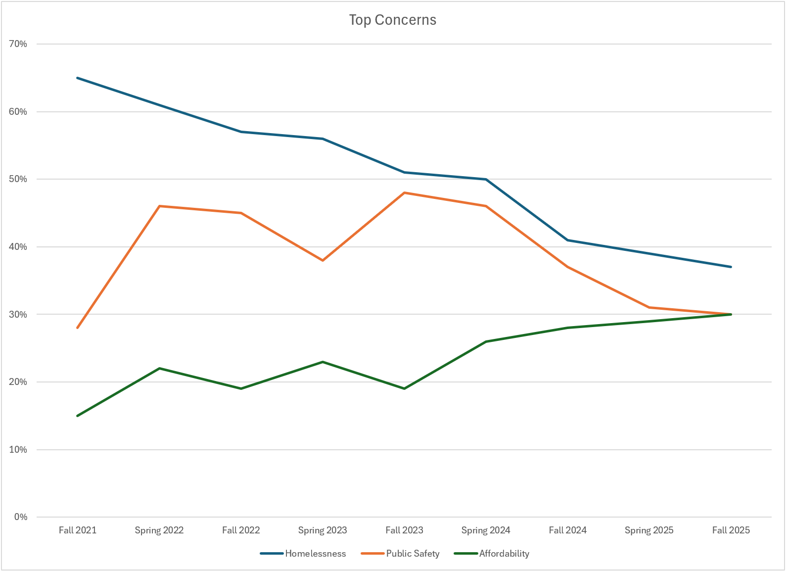 The Seattle Metro Chamber publishes a survey, called The Index, twice a year that asks voters in Seattle how they feel about the city. One of the questions they ask every year is "What are the issues facing Seattle that you are most frustrated or concerned about?". Before Spring 2024 the top concerns of "homelessness" and "crime/drugs/public safety" were a much higher concern to voters compared to the third item of "cost of living/affordable housing", a 29 point difference between the two in Fall 2023. However, in the Spring 2024 report affordability jumped 7 points and only continued to increase in importance. Meanwhile the other two issues dropped in importance.